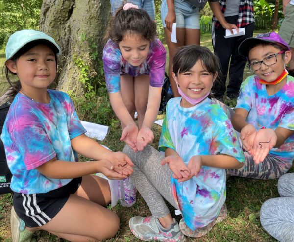 • Four school aged girl wearing tie-dyed shirts looking at the camera holding worms in their hands.